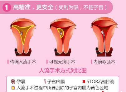 配合先进的可视人流系统,让医生在可视系统下,清晰地看到附着在子宫内壁上的孕囊,并能看到每一步操作情况,目标明确,所以操作时间短,出血少,在减少病人痛苦的同时,也不会引起宫颈及子宫的损伤。